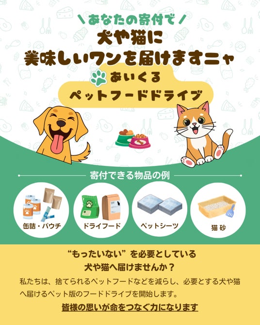 寄付の対象となるのは、犬または猫用のペットフード、ペットシーツと猫砂です。いずれも未開封または未使用のものとなります。またペットフードは常温保存可で賞味期限1カ月以上、製造者又は販売者表示のあるものに限ります。また、豊橋市が主催あるいは共催するイベント会場などでも受け付けを予定しています。イベント出店情報はあいくるの公式ホームページ(HP)やインスタグラムでご確認ください。