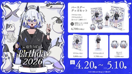 本日・4月20日に誕生日を迎えた亞生うぱるのバースデーグッズの詳細を公開するとともに、公式オンラインショップ「VEE Official Shop」にて受注販売を開始しました。