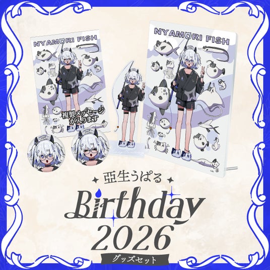2026年の亞生うぱるのバースデーグッズは、描き下ろしイラストを使用した「アクリルパネル」と「アクリルスタンド」と「缶バッジ」が登場!