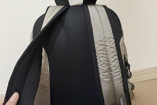 肩ひもの厚みは理想よりやや薄めですが、タウンユースなら許容範囲。背中のクッションはしっかりしています。軽さとクッション性はトレードオフといった感じでしょうか。