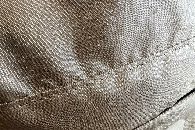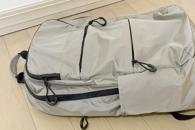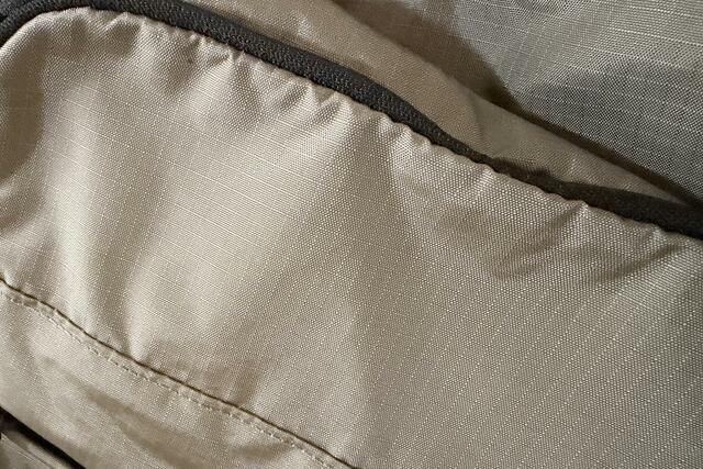 薄手で軽量ながら、格子状に編み込まれたリップストップ生地には適度なハリがあります。さらに撥水仕様。いつもバックパック用のレインカバーを持ち歩いているのですが、カバーなしでもある程度雨に耐えられるといいなぁ……と、期待が膨らみました。
