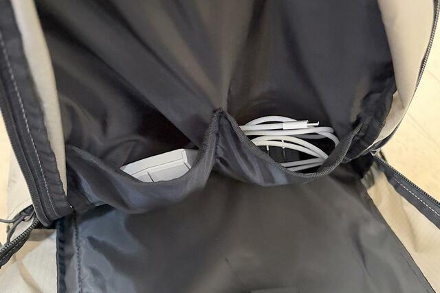 またメイン収納部の内側には、2つに仕切られた小さなポケットがついているのですが、PCの充電ケーブルやマウス、イヤホンなどを入れています。仕切られているので、ケーブルが絡まったりもせず、こちらも取り出しやすいです。