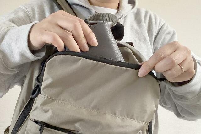 最初からサイドポケットにモノを入れて歩くのは、個人的にはあまり好みではないのですが、ペットボトル飲料を買ったときや折りたたみ傘を使ったときなどに、やっぱり必要です。