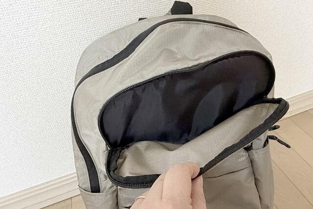 一般的なバックパックの外ポケットは大きく1つだけのことが多いのですが、このバックパックは3段に分かれています。