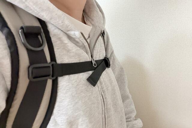 また、かなりの距離を歩くこともあるので、チェストストラップは必須! 荷物が入っていてもバッグが体に密着して左右に振られにくくなり、歩行中の疲れ方が劇的に変わります。