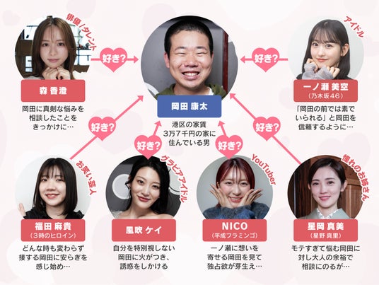 これを皮切りに、乃木坂46の一ノ瀬美空をはじめ、女性たちが次々と彼のアパートを訪れ、猛烈なアプローチを開始する。その数、なんと6人。