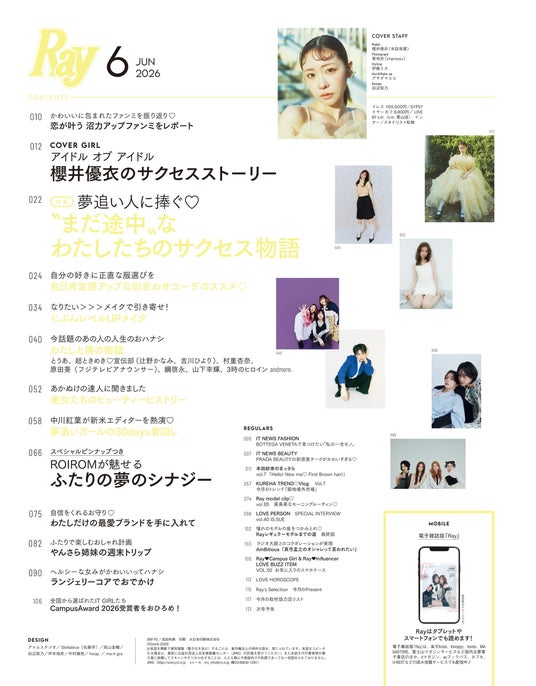 2026年4月23日(木)に発売する2026年6月号の通常版表紙は櫻井優衣(FRUITS ZIPPER)、特別版表紙はROIROMがそれぞれ務めます。今号の大特集テーマは「“まだ途中”なわたしたちのサクセス物語」。夢や憧れを持つ全ての人に向けて、なりたい自分になるためのヒントをぎゅっと詰め込んだ一冊です。いま話題の方々が明かしてくれる成功の秘訣や、いまからでも真似できるファッションやヘアメイクなどのポイントもご紹介しています。【商品情報】