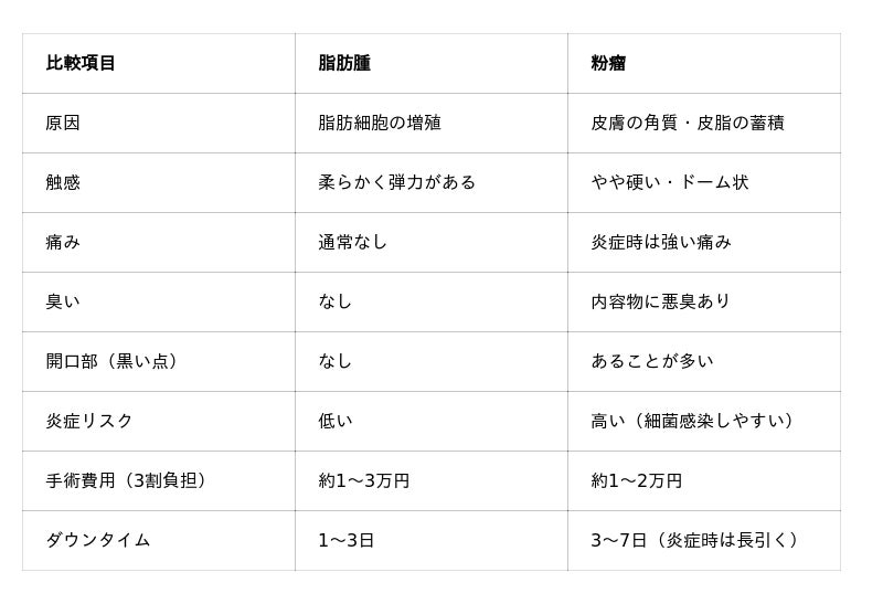 脂肪腫は柔らかく弾力があり、痛みや臭いはありません。一方、粉瘤は表面に黒い点(開口部)が見られることが多く、細菌感染を起こすと赤く腫れて強い痛みを伴います。粉瘤は炎症を繰り返すリスクがあるため、脂肪腫より治療の緊急性が高いケースが多いです。どちらも日帰り手術で摘出可能ですが、正確な診断のためには専門医の診察が必要です。