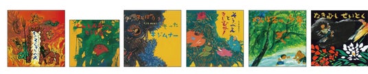 左から『じごくのそうべえ』(1978年)『とんとんみーときじむなー』(1987年)『てっぽうをもったキジムナー』(1996年)、『そうべえときじむなー』(2018年)やんばるの少年』(2019年)『なきむしせいとく』(2022年)