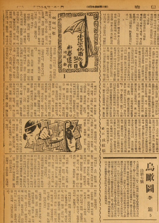「朝鮮中央日報」1934年8月1日号に掲載された「小説家仇甫氏の一日」連載第1回。李箱は「河戎(ハユン)」の号で挿絵を寄せた。同じ紙面に李箱の詩「烏瞰図」も掲載されている。画像出典=韓国国立中央図書館