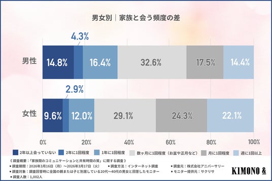一方で、『1年に1回程度』『2年に1回程度』『2年以上会っていない』と回答した割合は、男性が約4割に対し、女性は約2割となり、男性の方が相対的に会う頻度が低い傾向のようです。