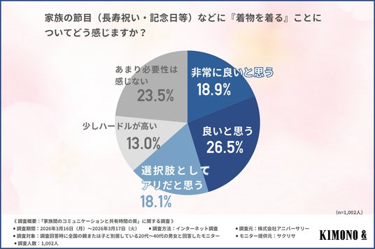 こうした「家族時間の形骸化」に対し、6割以上の人々は現在の過ごし方に物足りなさを感じており、非日常的な体験や特別な場所でのアップデートを求めています。その具体的な手段として、家族の節目に「着物を着る」という選択肢には6割以上が肯定的であり、装いを変えることが共有時間の密度を高め、記憶に残る場を創出するための有効な手段として期待されています。