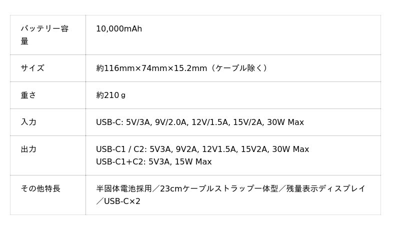 ■SOLIDZ Power Bank Model FT(10000mAh, 30W, Built-In USB-Cケーブル)