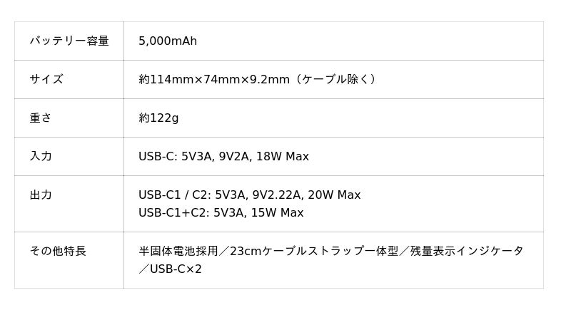 ■SOLIDZ Power Bank Model FT(5000mAh, 20W, Built-In USB-Cケーブル)
