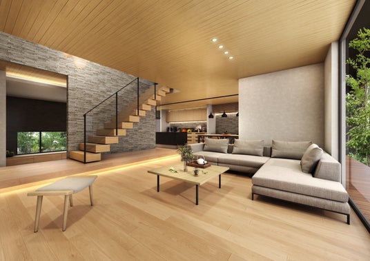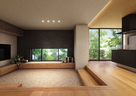 ダウンフロアリビング:包まれるような安心感 視線が自然と遮られ、落ち着きが生まれる。 家族が同じ空間にいながら、それぞれの時間を過ごせる“ゆるやかな分離”