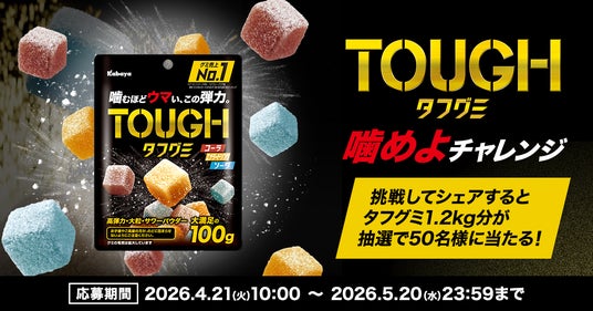 カバヤ食品株式会社は、年間売上高が当社の製品ブランドとして初めて100億円を突破し、3年連続でグミ市場単品売上金額No.1※1を獲得した『タフグミ』の新Web-CMを、2026年4月21日(火)より公開しますので、お知らせします。
