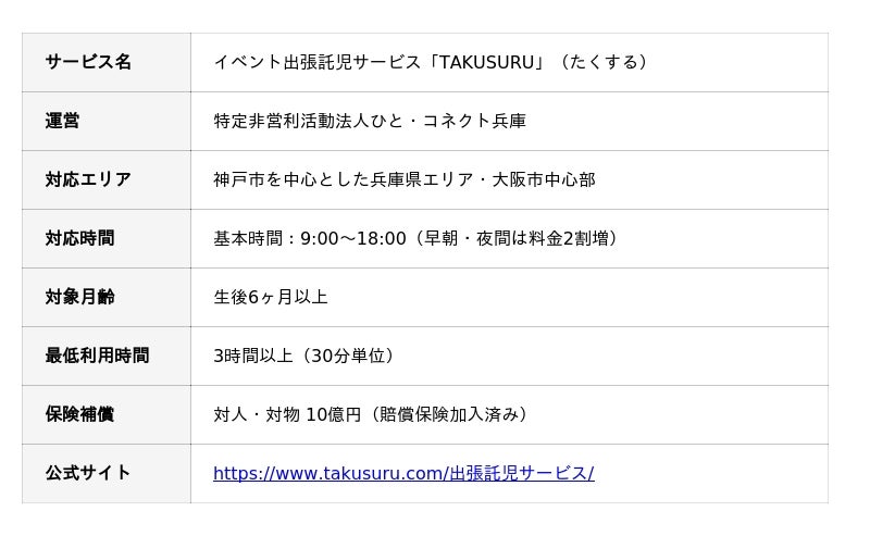 特定非営利活動法人ひと・コネクト兵庫(代表理事:戎 康宏 兵庫県神戸市、以下「当法人」)は、イベント主催者向けの出張託児サービス「TAKUSURU」を提供しています。学会・研究発表・企業セミナー・コンサート・バーゲンなど、あらゆる場面で乳幼児を安全にお預かりし、参加者が子育て中であっても安心して活動に集中できる環境を整えることを目的としています。