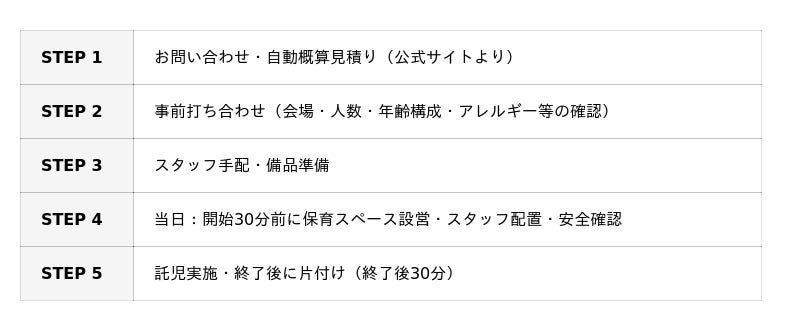 保育スペースの設営・運営・スタッフ手配まで一括対応。自動概算見積りフォームも提供しており、問い合わせから実施までスムーズに進められます。