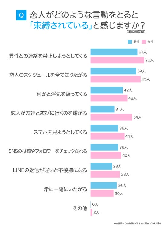 交際経験がある成人男女200人に「恋人のどのような言動を『束縛されている』と感じますか?(複数回答可)」と尋ねたところ、最多は「異性との連絡を禁止しようとしてくる」131人(65.50%)でした。