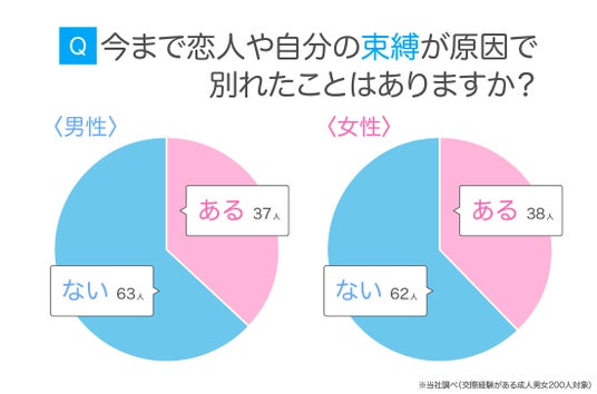 男女差はほとんど見られず、いずれも約4割が束縛を理由とした別れを経験している結果となりました。