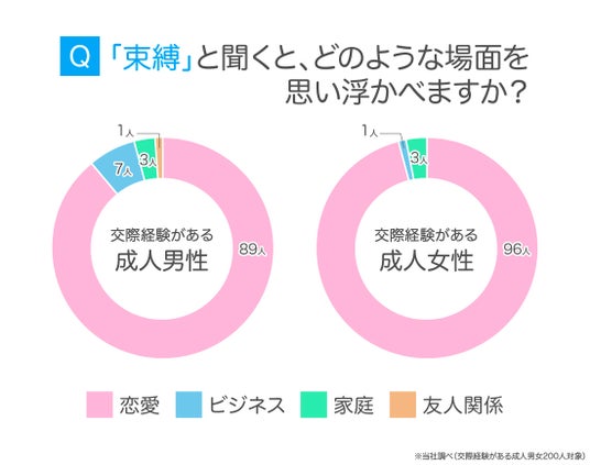 交際経験がある成人男女200人に「『束縛』と聞いて思い浮かべる場面」を尋ねたところ、「恋愛」が185人(92.50%)と圧倒的多数となりました。