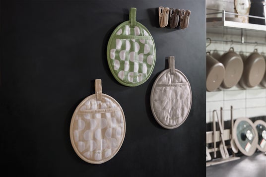テレビでも紹介されたマグネットでくっつけて収納できる、ミトン鍋敷きに丸形が追加発売。手にフィットしやすい丸形状にすることでミトンとしてもさらに使いやすくなりました。