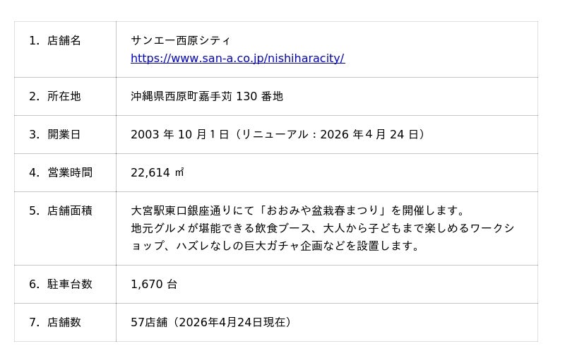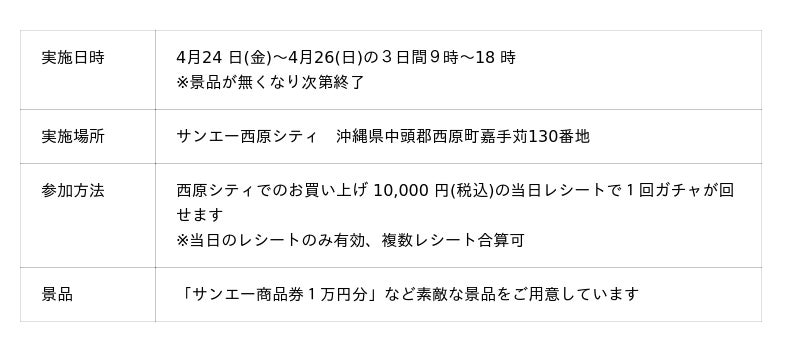 今回のリニューアルオープン記念企画のご参加には西原シティでのお買い上げ 10,000 円(税込)の当日レシートで1回ガチャが回せます。「サンエー商品券1万円分」など素敵な景品をご用意しています。2026年4月24 日(金)~4月26(日)の3日間9時~18 時で開催されます。