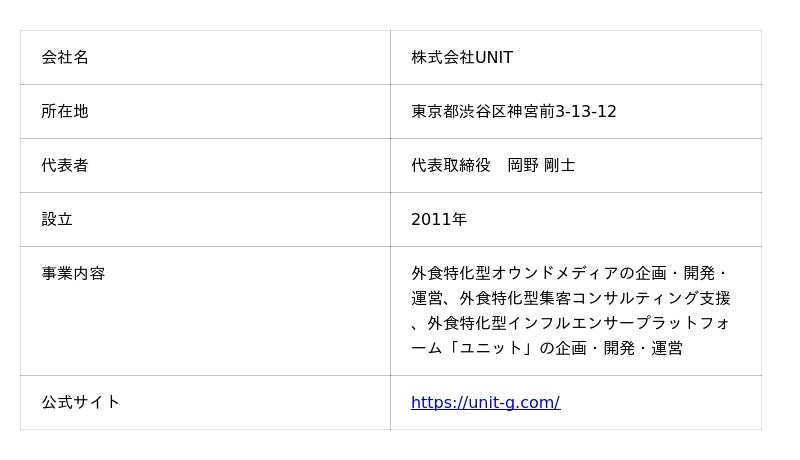 UNITは、グルメフード業界に特化したWebマーケティング支援を行う企業として、2011年の創業以来、飲食店・フードブランドの集客支援に注力してまいりました。本取り組みでは、UNITが展開するインフルエンサーPR事業「ユニット」の運用ノウハウを活かし、「プレミアムカルビ」における話題性のあるお店づくりと来店促進に向けた施策を推進しています。