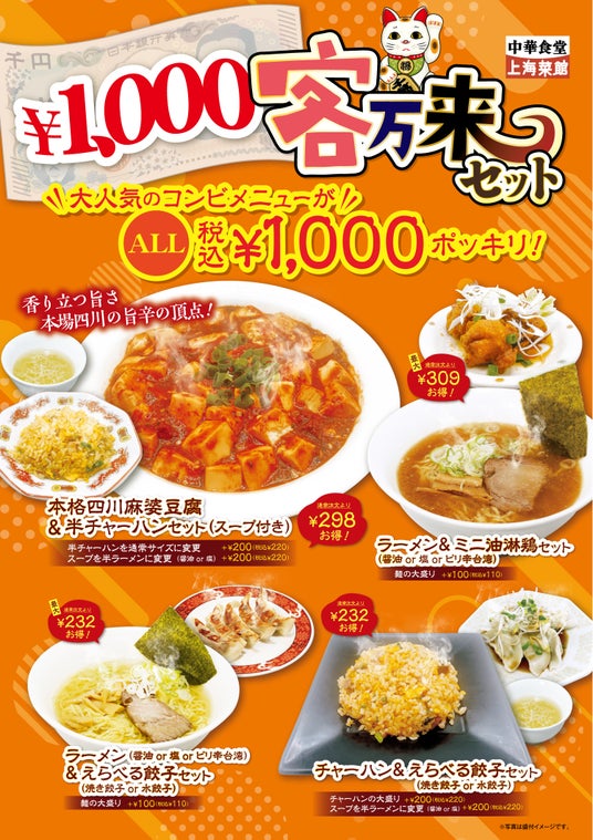 株式会社サリックストラベル(本社:埼玉県さいたま市、代表取締役社長:柳 朱理)が運営する中華料理店「中華食堂 上海菜館(アルーサ店)」は、人気メニューのセットが”いつでも1000円ポッキリ”で食べられる新たな定番商品「¥1000客万来セット」の提供を開始いたしました。