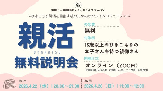 生きる力を育むことで孤立孤独を解消します~ひきこもり・不登校サポートの一般社団法人グッドライフジャパン(山梨県北杜市須玉町江草5573 代表理事:川田史郎)は、ひきこもりの子どもを持つ親を対象としたオンラインコミュニティ『親活(おやかつ)』を新たに開始し、その概要を紹介する無料オンライン説明会を2026年4月22日および4月26日に開催します。