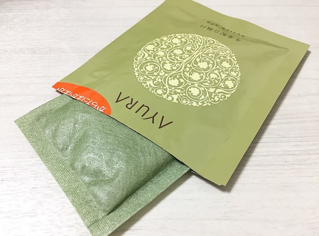 袋状の包みがひとつ入っていて、これを浴槽に入れてもみこんで使います。少しずつお湯が濃い色に染まっていきますよ。