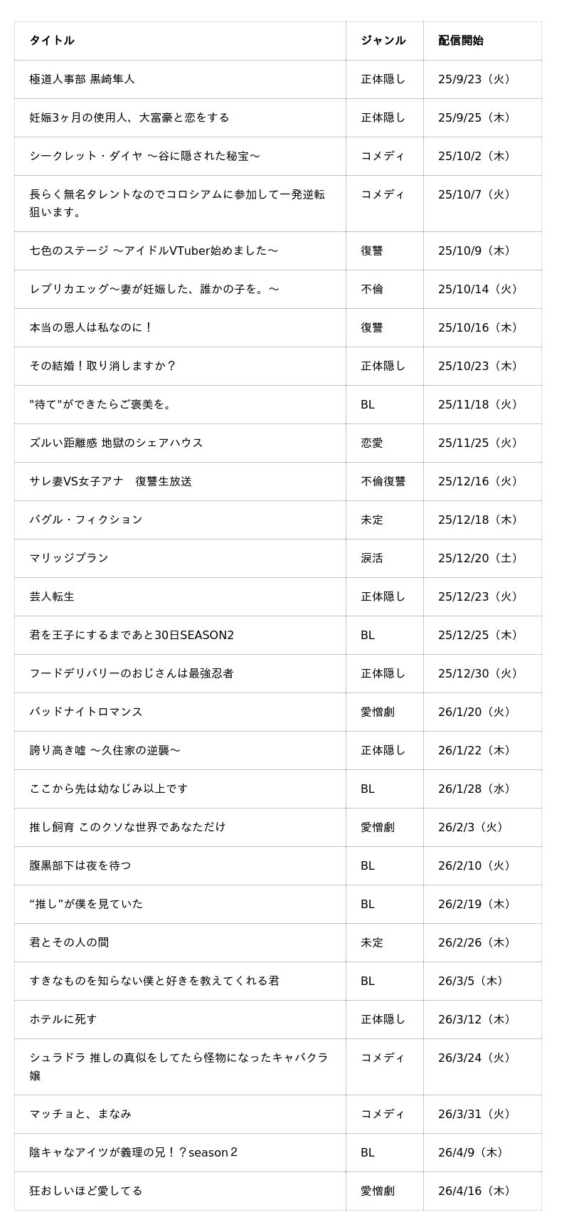 今回の新作ラッシュでは、日常の喜怒哀楽を切り取ったコメディから、スリリングなサスペンス、既存のドラマの枠を超えた多彩なジャンルが次々と登場します。1話数分のショートドラマだからこそ実現できる、次から次へと新しい世界に没入する「連続した衝撃」をお届けします。新作ラインナップの特長: