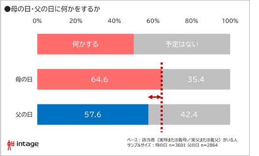 ・母の日に「何かする」人は母がいる人のうち64.6%。父の日は57.6%と母の日が上回る