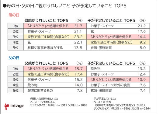 ・子のプレゼント1位は、母へ「スイーツ」、父へ「飲み物」に対して、親としては「感謝の言葉」が一番うれしい