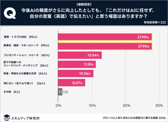 AI技術が今後さらに進化し、翻訳精度が向上したとしても、「これだけはAIに任せず、自身の言葉(英語)で伝えたい」と考える場面についての調査では、人間同士の感情的な結びつきが重視される結果となった。
