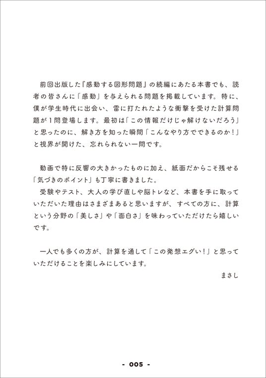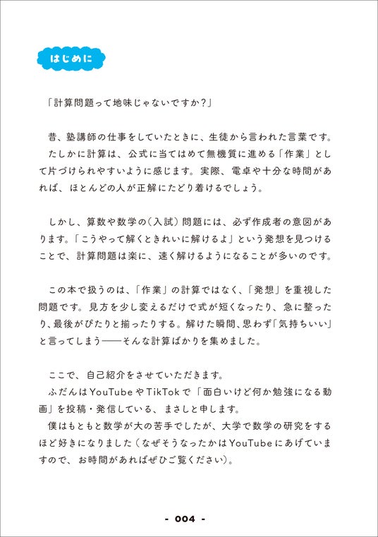 「計算問題」と聞くと、一見退屈に聞こえるかもしれませんが、本書に掲載している問題は公式にあてはめるだけで解ける問題や、ただ長い計算をする問題ではありません。ちょっとした発想で一気にきれいに解ける、「程よく頭を使える」問題ばかり。本書の著者であるまさし氏は「はじめに」の言葉で以下のように綴っています。