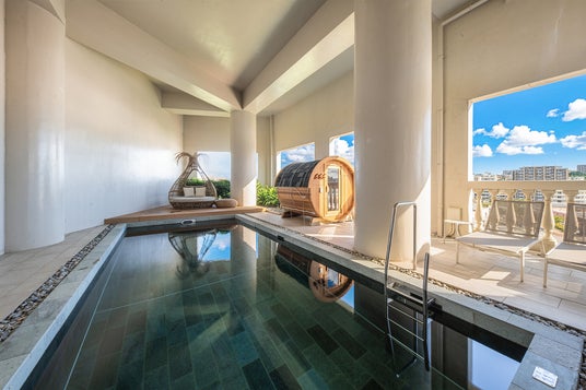 ・プールを水風呂に: サウナの後は、目の前のプライベートプールへ直行。広々とした水面での「浮遊浴」は、客室サウナならではの贅沢です。