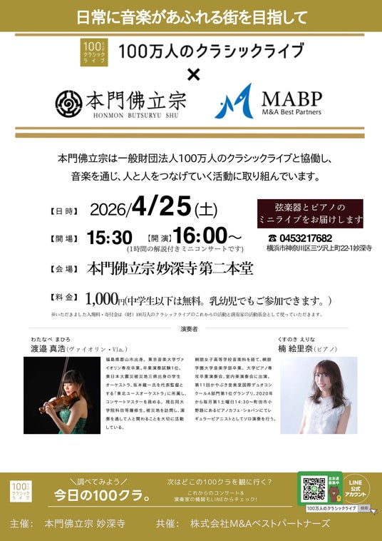製造、建設、不動産、医療・ヘルスケア、物流、ITに特化したM&A仲介を行う株式会社M&Aベストパートナーズ(本社:東京都千代田区、代表取締役社長:齋藤 達雄 以下M&Aベストパートナーズ)と、一般財団法人100万人のクラシックライブ(東京都千代田区、代表理事:蓑田秀策 以下100万人のクラシックライブ)は、4月25日(土)16:00より、本門佛立宗 妙深寺にて、クラシックライブを開催することをお知らせいたします。