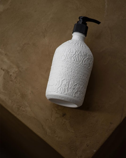 山崎氏がボトルに書き下ろした詩を、嬉野肥前吉田焼の窯元にて磁器に彫り起こした作品。そこに、茂田がこれまでのパラダイムを洗い流し、新たなパラダイムを迎える意を込めて特別に調香したハンドウォッシュを満たしました。1本ずつエディションナンバーが刻まれています。
