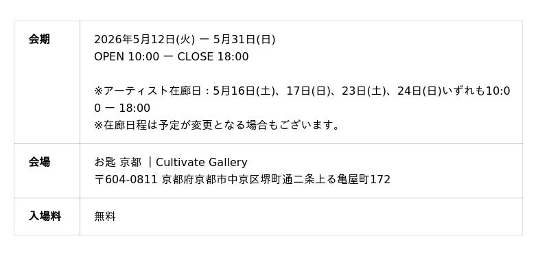 2024年12月の東京、2025年9月の大阪に続く、3rd Editionとなる本展は新作を加えて、京都 [2026年5月12日(火) ー 5月31日(日)] から、大阪 [2026年6月3日(水) ー 9日(火)] の2会場を巡回いたします。