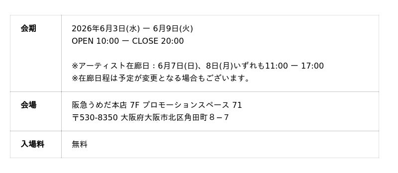 続く大阪会場は、大阪市内の百貨店や商業施設、ギャラリーなどを舞台に、街を巡りながらアートやデザインに出会う周遊型イベント「Osaka Art & Design 2026 コンテンツとして、阪急うめだ本店7Fにて展開。