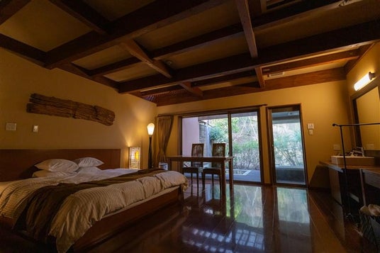 夕食・朝食共に部屋食となっており、ご利用いただけるオプションサービスもすべてお部屋にてサービスいたします。各部屋にはいつでも利用可能な露天風呂と室内ジャグジーを完備。ベッドはシモンズ製を採用しており極上の睡眠をお楽しみいただけます。