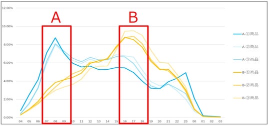 ■アキュアの自販機データ 時間帯×商品別数量構成比(抽出期間:25年3月~8月)】