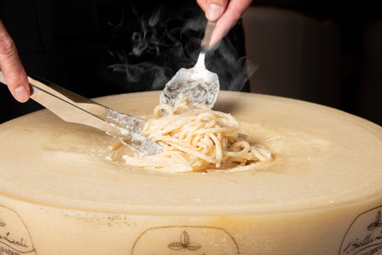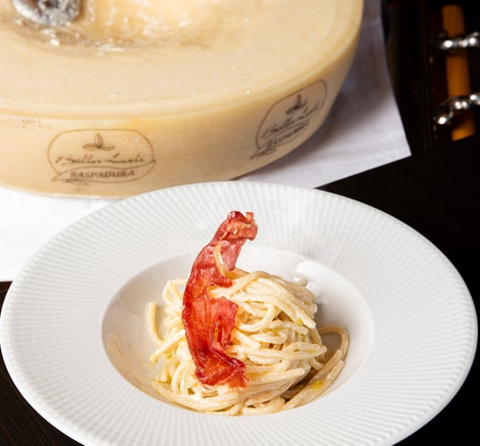 お客様の目の前でチーズを削りながらパスタを絡め、出来立てならではの香りとコクを楽しめるライブ演出です。