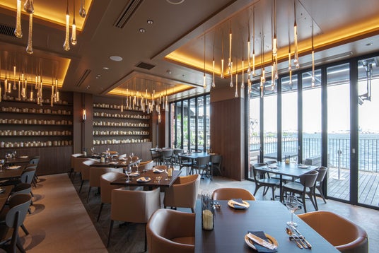 横浜みなとみらいの海沿い施設「MARINE & WALK YOKOHAMA」に位置し、ベイエリアの景観を楽しめる開放的な空間を提供します。テラス席も備え、昼夜で異なる雰囲気を楽しめるロケーションです。