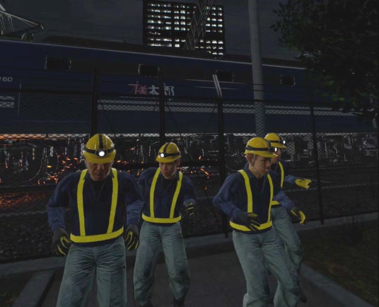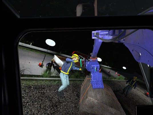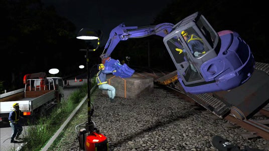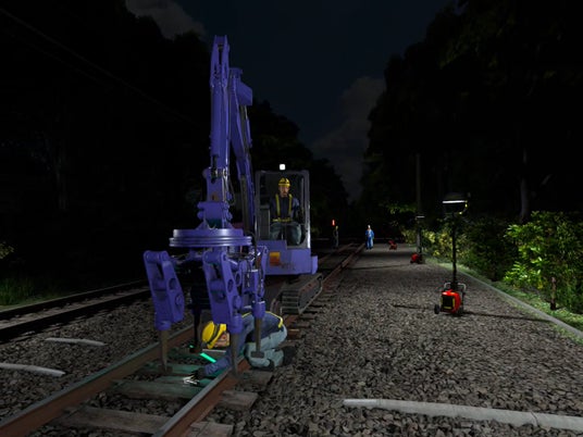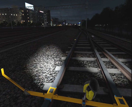 夜間のレール交換作業終了時、軌道検測装置等の資機材を線路上に置き忘れたまま線路開通確認を終了してしまうシナリオです。 照明の当て方や確認の不徹底が、貨物列車との衝突(限界支障)を招く恐怖を体験し、点検の重要性を学びます。