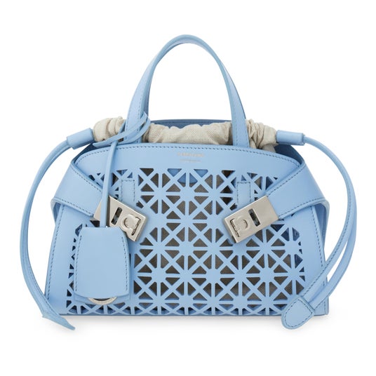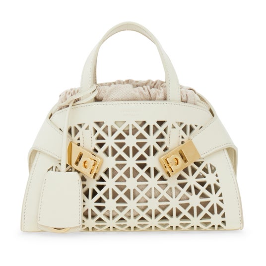 「Hug Bag Mini (ハグ バッグ ミニ)」には、精緻なレーザーカットによるパターンが施され、その正確に繰り返される意匠は、伝統に寄り添いながら技術を進化させるイタリアのものづくりが誇る、高い品質基準を雄弁に物語っている。