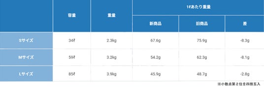 旧トップバリュ軽量ジッパーキャリーと比較すると、容量が増え、1Lあたりの軽量化を実現しています。