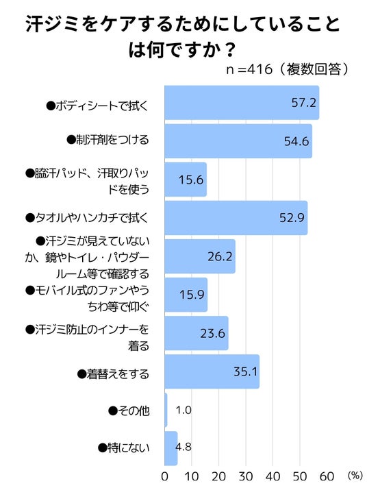 1位:「ボディシートで拭く」(57.2%)、2位:「制汗剤をつける」(54.6%)、3位「タオルやハンカチで拭く」(52.9%)