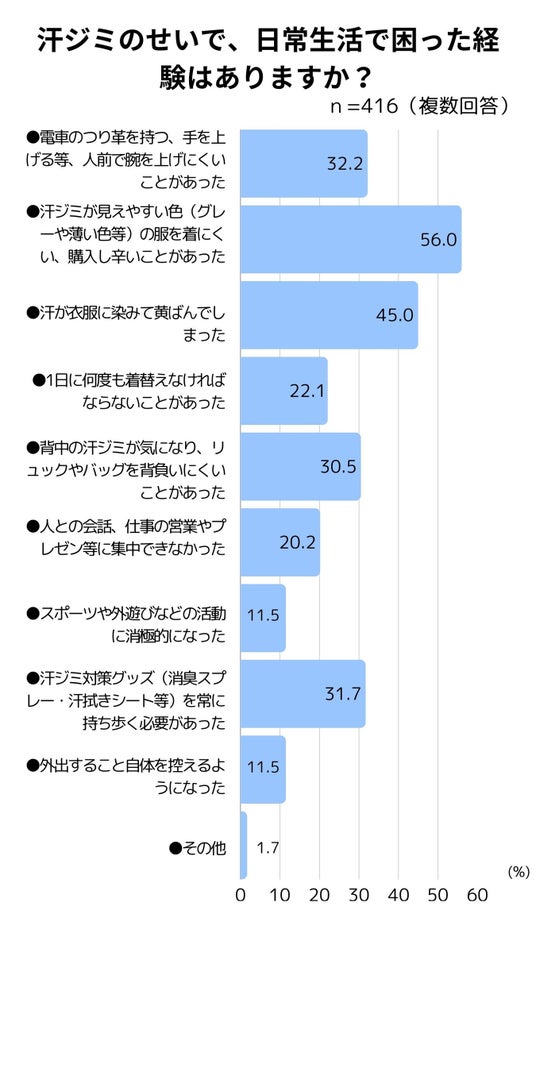 1位:「汗ジミが見えやすい色の服を着にくい、購入し辛いことがあった」(56.0%)、2位:「汗が衣服に染みて黄ばんでしまった」(45.0%)、3位「電車のつり革を持つ、手を上げる等、人前で腕を上げにくいことがあった」(32.2%)、4位:「汗ジミ対策グッズを常に持ち歩く必要があった」(31.7%)、5位:「背中の汗ジミが気になり、リュックやバッグを背負いにくいことがあった」(30.5%)